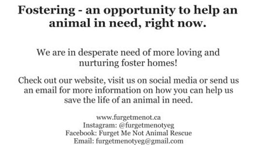 To request some of our foster postcards, send us an email at furgetmenotyeg@gmail.com and one of our volunteers will be in touch!